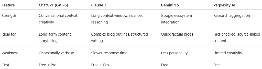 If your priority is writing engaging, readable blog content, ChatGPT remains the best all-rounder. For data-driven or factual blogs, combine it with Claude or Perplexity for optimal accuracy and tone balance.